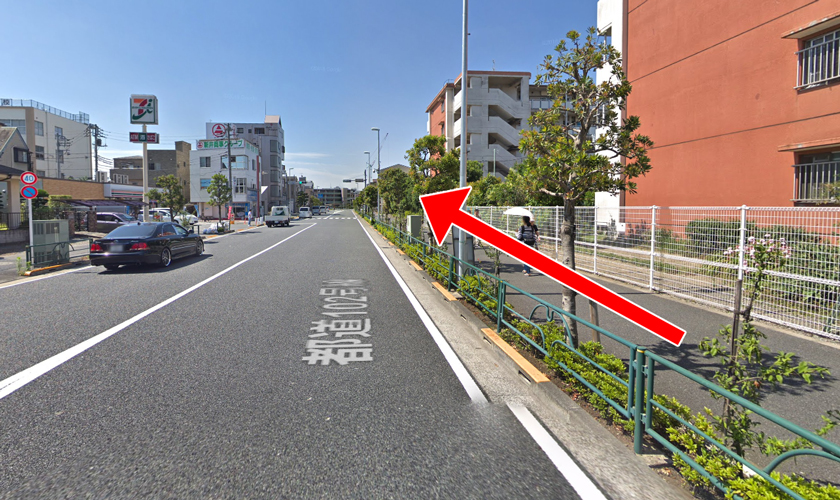 途中、左手(道路 向かい沿い)に新井酒店・セブンイレブンが見えます。更に約100メートル進みます。