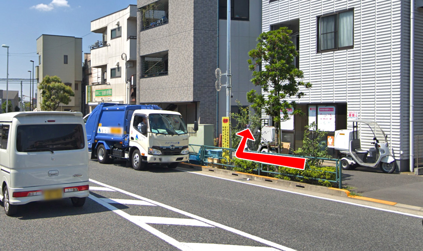 整骨院の手前約10メートルを右に入り、突き当りに「若狭法律事務所」のプレートと「白と緑のツートンカラー」の戸建て(3階建)が見えてきます。